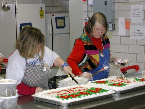 Tanya and a guest put finishing touches on the diabetes cakes.